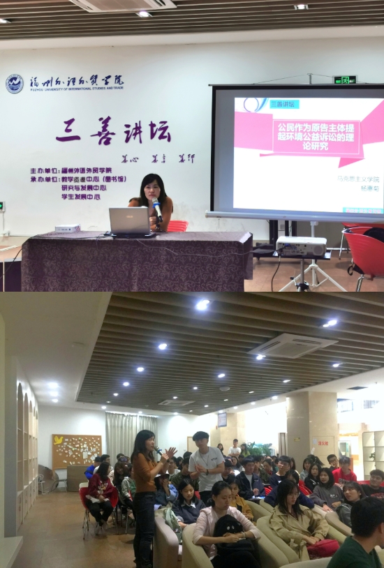 10月29日,马克思主义学院杨惠菊副教授在图书馆“三善”讲坛作“公民作为原告主体提起环境公益诉讼的理论研究” 专题讲座,吸引近百名师生到场听讲。