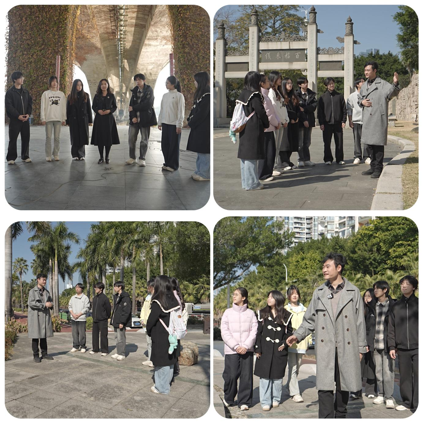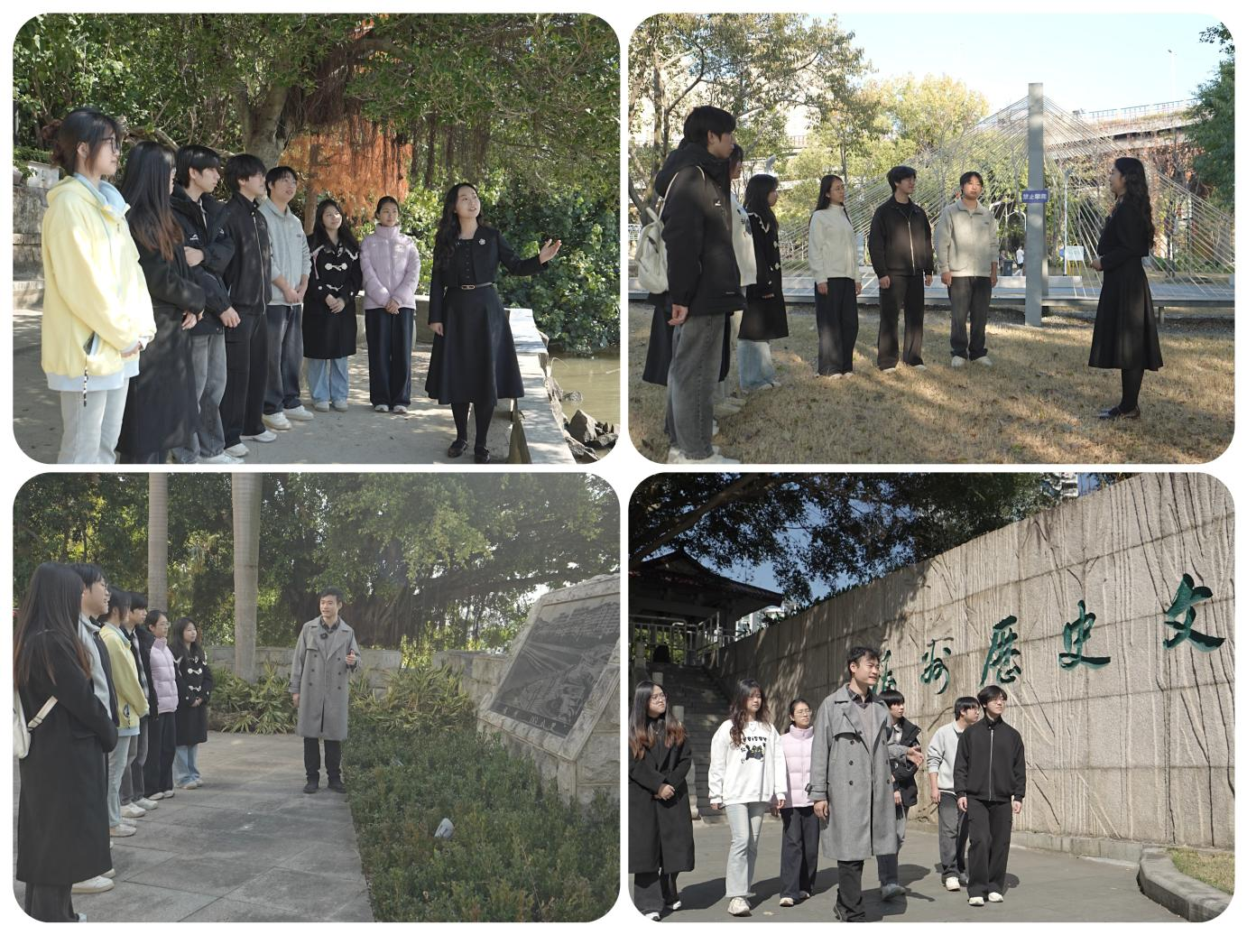 此次行走的大思政课以“绿色晒福”为核心主线,带领师生在实景观察与理论阐释中,层层解码福建生态文明的“福泽内核”。在闽水园千公里江堤纪念广场,斑驳的影雕镌刻着闽江治理的岁月痕迹,清晰的洪水水位刻度无声诉说着城市与水的博弈历程。两位老师结合史料与现实,深入解读“绿水青山就是金山银山”理念在福建的生动实践,剖析江堤建设从“防洪护城”到“生态惠民”的转型逻辑。在福州历史文化长廊,师生围立在花岗岩浮雕前,老师循着“先民拓土”、“海洋文化”等历史场景,讲解人水共生的千年智慧,阐释福建先民“顺时应势、道法自然”的生态哲学,让抽象的生态文明理论转化为可感可知的历史脉络与实践成果。
