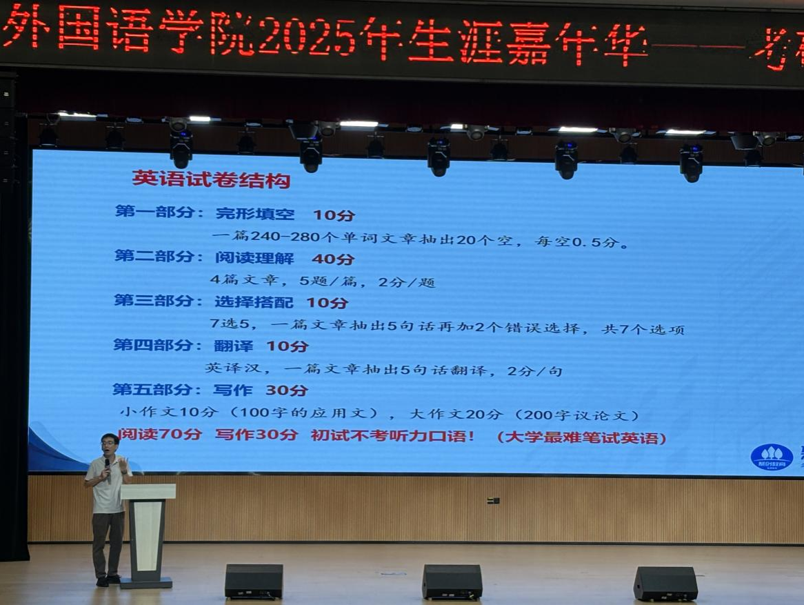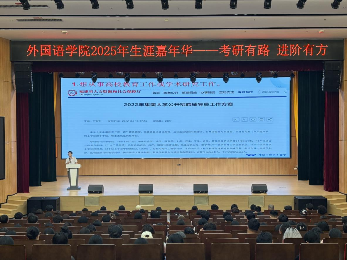 9月22日,为帮助2025级本科全体学生和专升本全体学生尽早明晰考研方向,搭建高校备考交流桥梁,外国语学院联合聚创考研分别于云帆报告厅和人文楼3-102开展新生升学考研启蒙教育讲座。讲座分别由辅导员张天英和黄鸿达主持,聚创考研福州分校长江斌主讲,全体2025级新生参加。