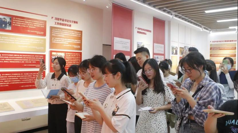 在现场,大家依次参观了馆内领航篇、领悟篇、百年辉煌、践行篇等内容版块。在馆内领航篇版块,大家通过诵读“十个明确”“十四个坚持”“十三个方面成就”等对习近平新时代中国特色社会主义思想进行了深入学习,并通过互动触摸屏翻看习近平新时代中国特色社会主义思想的内容,进一步强化理论学习。期间,郑陈婷老师带领同学们重温入党誓词,铿锵有力的宣誓声响彻场馆。