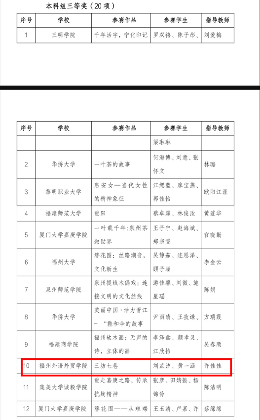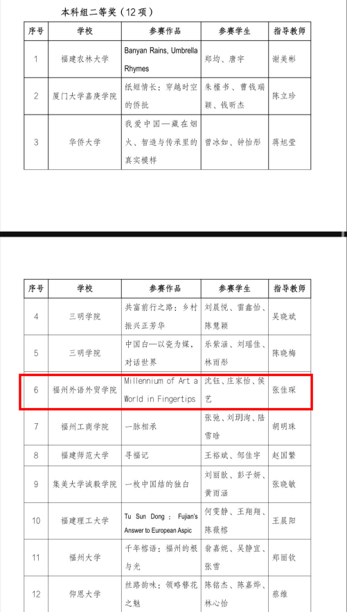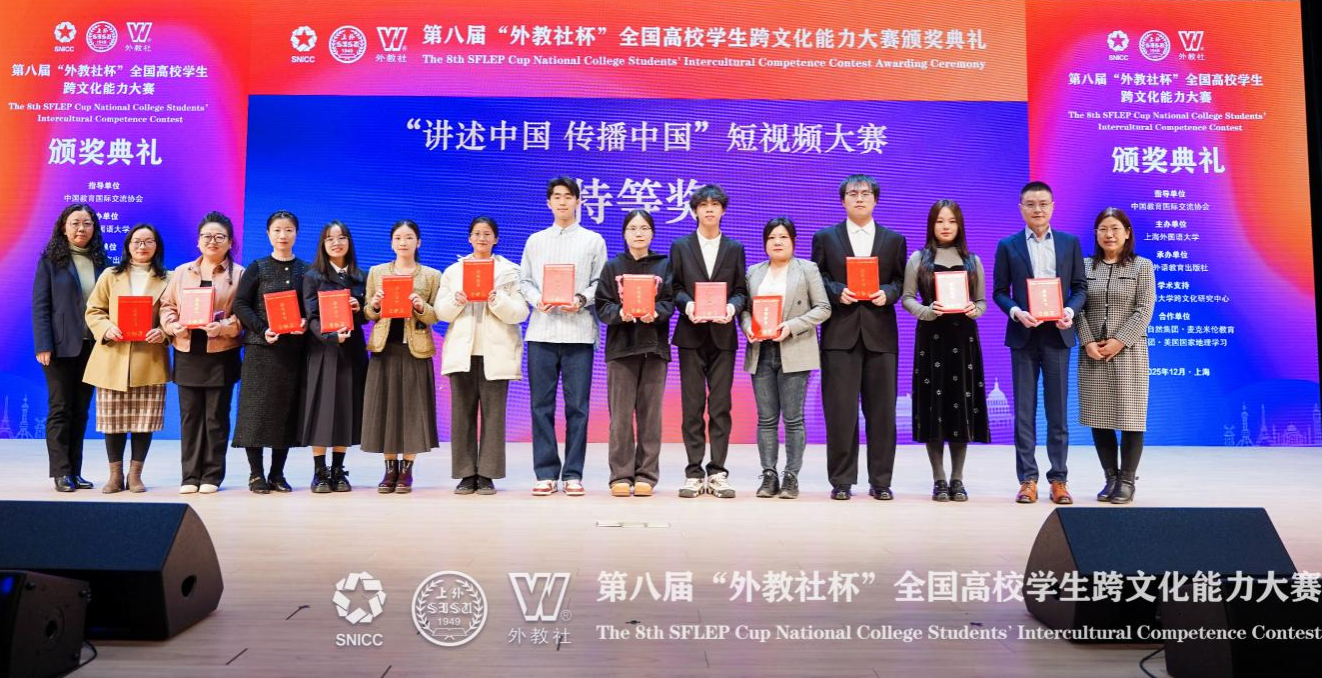 近日,第八届“外教社杯”全国高校学生跨文化能力大赛“讲述中国 传播中国”短视频大赛圆满落幕。在与全国2500余件作品的激烈角逐中,我院学子取得突破性成绩,荣获全国总决赛特等奖1项,以及福建赛区二等奖1项及三等奖1项。我校是福建省唯一入围全国赛并夺得特等奖的高校,学子们的优异表现充分印证了其在跨文化传播与实践创新方面的突出实力。此外,学校也因出色的赛事组织工作,获颁“优秀组织奖”。