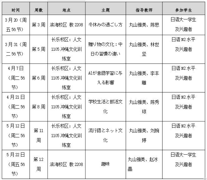 第三期日语角将于4月7日(周二 5-6节),在长乐校区人文1105冲绳文化训练室开展,主题为「AIが言語学習に与える影響」(AI对语言学习的影响),由丸山雅美老师与李丰雕老师带队!同时,本学期后续还有多期主题丰富的日语角活动,具体安排如下: