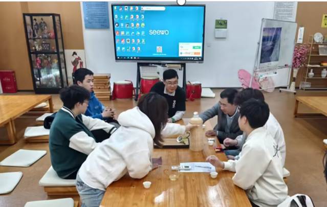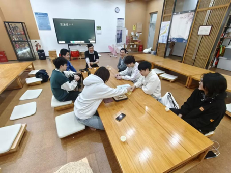 活动现场,日语角为同学们精心准备了茶具、茶叶与一次性茶杯,在充满日式风情的冲绳文化训练室里,原木长桌、日式人偶、传统太鼓环绕,氛围感直接拉满!大家围坐在一起,伴着袅袅茶香,开启了一场轻松又深刻的文化交流。