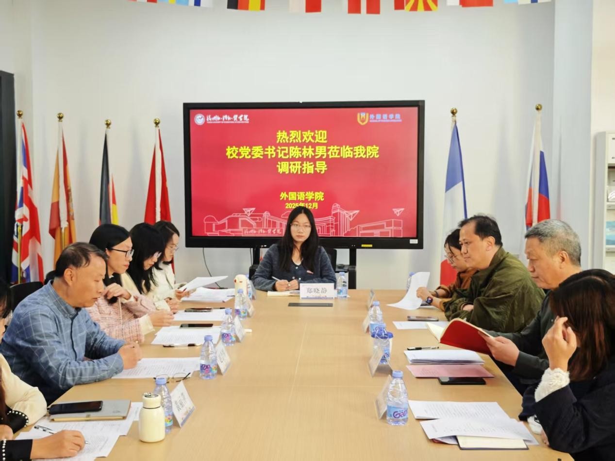 2025年12月2日,校党委书记陈林男一行莅临外国语学院,就学院发展建设情况进行深入调研并指导工作。座谈会在外国语学院人文4-306会议室举行,外国语学院领导班子成员、各系部主任及办公室负责人参加会议。