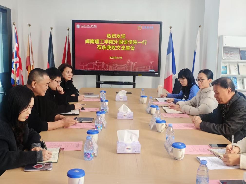 2025年12月29日,闽南理工学院外国语学院党委书记、常务副院长郑春雷、院长助理许建、王美雪、翻译教研室主任张璋、阿拉伯语教研室主任潘雪婷等一行莅临我院,就本科专业人才培养方案制(修)订工作开展专项调研交流。我院高度重视此次交流,由院长赵会军、院党委书记杨惠容、副院长黄丽萍、院长助理杨帆、翻译系主任吴菲娜、西班牙语系主任潘文翠等组成接待团队,全程参与座谈。