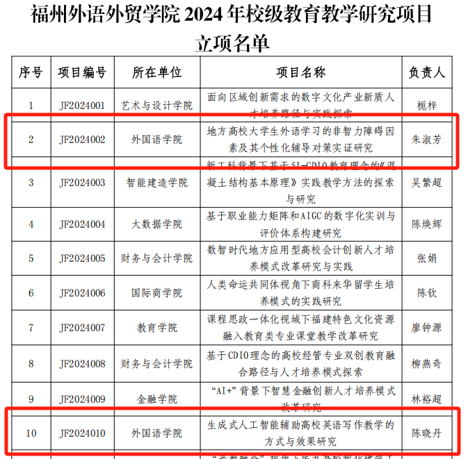 近日,我校正式公布2024年度教育教学改革研究项目立项名单。我院申报的三项课题三项课题脱颖而出,成功获批校级教改项目,分别为:《地方高校大学生外语学习的非智力障碍因素及其个性化辅导对策实证研究》(负责人:朱淑芳副教授)、《生成式人工智能辅助高校英语写作教学的方式与效果研究》(负责人:陈晓丹副教授)、《侯官文化在高校英语教学中的传承与创新研究》(负责人:吴晓副教授)。此次立项充分体现我院教师在英语教学改革领域的创新探索,为构建校本特色教学模式提供了新的研究路径。