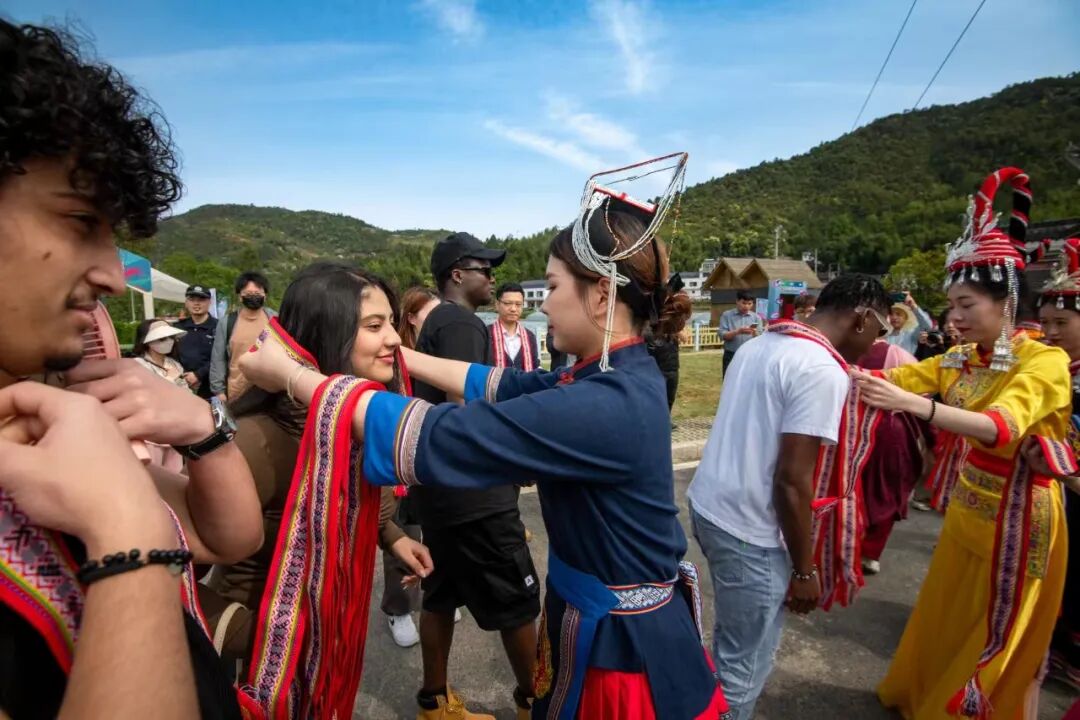 在“三月三”畲族文化节活动现场,身穿盛装的畲族姑娘们为国际生们一一献上畲族传统的欢迎丝带。从传统的畲族舞蹈、歌曲、戏曲等节目中,国际生们感受到了畲族文化的深厚底蕴和独特风采。独具特色的畲族摆字龙舞更是让国际生们大为震撼,巨龙翻腾起舞,巧妙地摆出“天下太平”、“人财两盛”等吉祥字样,寓意着畲族人民的幸福生活和美好愿景。国际生们纷纷表示,“三月三”畲族文化节不仅让他们领略到集山水交融、宜居宜游的浪“慢”山哈、田园宝“境”,更是让他们从农村治理、文化建设、民俗文化传承等方面感知全面、真实、立体的中国美丽乡村。