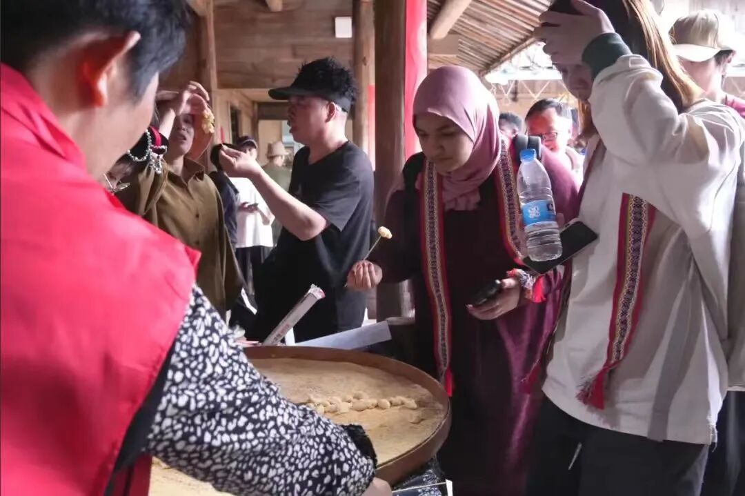 除了观赏文艺展演,“三月三”活动现场还设置了多个互动体验区。在畲村集市上,琳琅满目的手工艺品、特色畲族“乌饭”等美食吸引了国际生们驻足购买与品尝;在畲村体育游戏体验区,国际生们与畲族姑娘们一起尽享玩乐,参与畲族传统竹竿舞,感受畲族文化的独特韵味;在畲族文化展陈馆,国际生们深入了解畲族历史、文化和传统技艺。