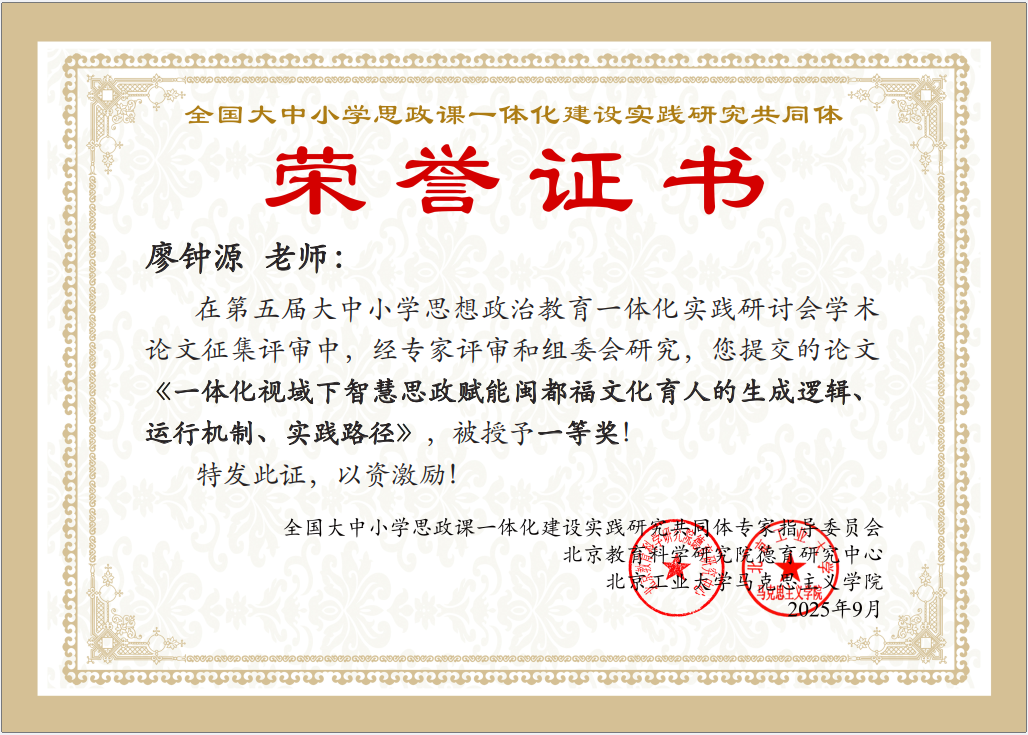 近日,第五届大中小学思想政治教育一体化实践研讨会在北京成功举办。本届研讨会以“深化思政铸魂育人工程,塑造立德树人新格局”为主题,吸引了全国400余位教育专家、一线教师参与。据悉,本次研讨会由全国大中小学思政课一体化建设实践研究共同体专家指导委员会、北京教育科学研究院德育研究中心、北京工业大学马克思主义学院等单位联合主办,致力于推动大中小学思政课一体化建设与实践创新。我院廖钟源副教授的论文《一体化视域下智慧思政赋能闽都福文化育人的生成逻辑、运行机制、实践路径》,经专家评审和组委会研究,在众多参赛论文中脱颖而出,荣获一等奖。