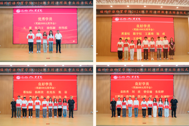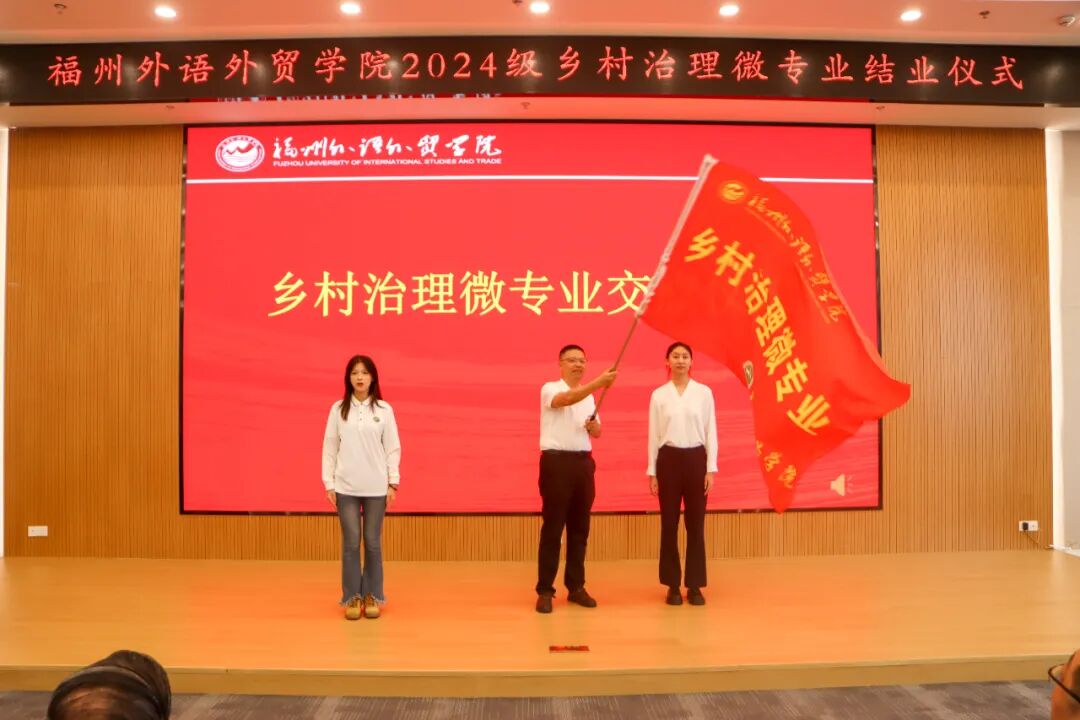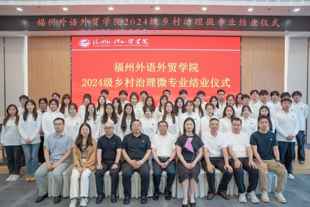 6月17日下午,以“以青春之我,筑乡村之梦”为主题,福州外语外贸学院乡村治理微专业2024级结业仪式圆满落幕,为这一年来的学习之旅画上了浓墨重彩的句号。校领导黄鸿鸿出席仪式并作总结讲话,福建致公经济研究院、乡村振兴学院院长李为,教务处副处长刘贤昌,财务与会计学院院长助理张智,教务处副科长詹明钢,乡村治理微专业授课教师及2024级、2025级乡村治理微专业学生参加仪式。结业仪式由乡村振兴学院副院长郑程挺主持。