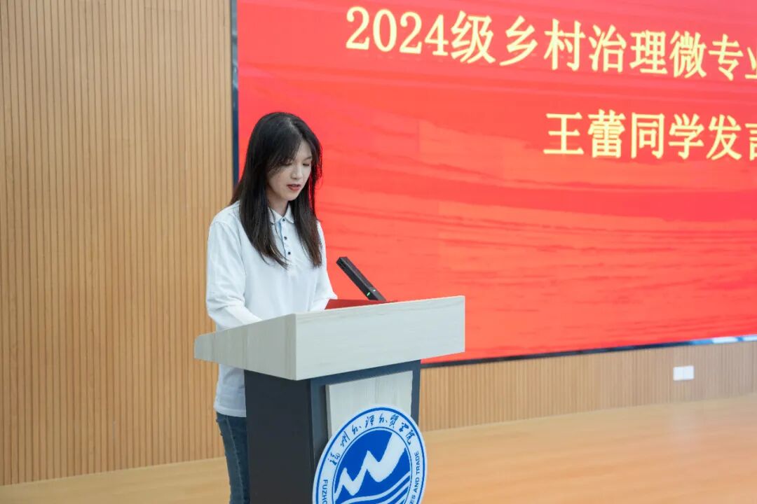 在学生代表发言环节中,2024级学生代表回顾了过去一年在微专业学习中的收获与成长,分享了校外教学中的经验和感悟,并表示将把所学知识运用到实际工作中,为乡村发展贡献自己的智慧和力量。