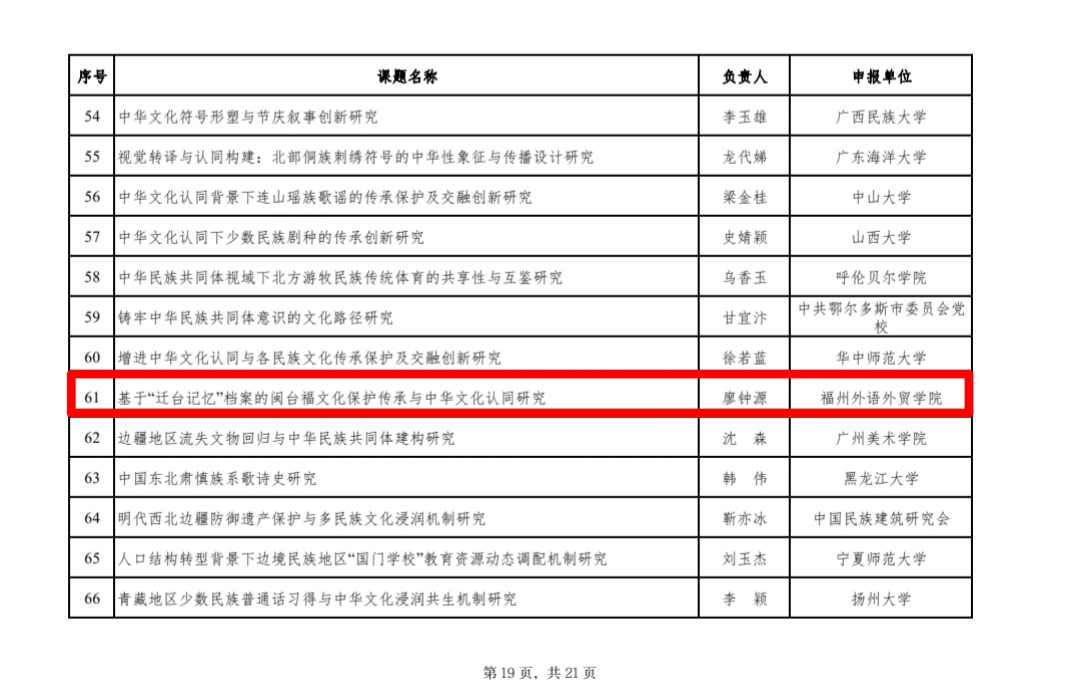 近日,国家民委正式公布了2025年度民族研究项目立项名单。福州外语外贸学院乡村振兴学院廖钟源副教授申报的《基于“迁台记忆”档案的闽台福文化保护传承与中华文化认同研究》课题已通过评审,并予以公示。