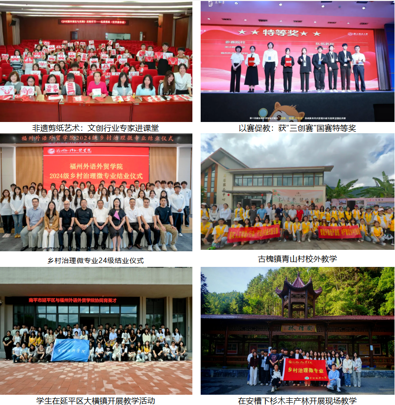 以“精专化、模块化、强实践”为特色,聚焦乡村振兴战略下的基层治理核心需求,围绕智慧生态与农业,文化旅游、数字营销、商务贸易、乡村规划等紧缺产业领域,构建“课程思政—项目驱动—场景实战—岗位实践”的递进式教学链条,形成“一核四力”模式。“一核”,即全校围绕“学科专业发展与服务乡村同频共振”这一核心,确保学科专业建设紧密结合乡村产业发展需求,为乡村产业发展提供有力的人才和智力支持。“四力”,即汇聚向心力、激发内驱力、增强协同力、提升战斗力,通过全方位的改革和创新,推动乡村产业人才培养工作取得实效。首届2023级乡村治理微专业36名毕业生就业率实现显著提升,人才培养模式成效显著。其中,3人成功考取福建农林大学等高校硕士研究生,3人通过“三支一扶”计划等项目投身基层服务,主动对接乡村振兴战略需求,实现个人发展与社会服务的有机结合。