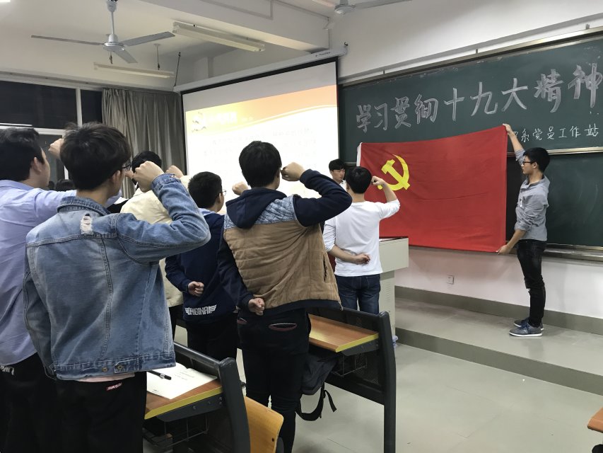 2017年11月16日下午18:30,经贸系学生党员工作站在教3101召开经贸系全体学生党员会议,本次会议以“学习贯彻党的十九大报告精神”为主题,向全体党员们宣讲大会的精神。