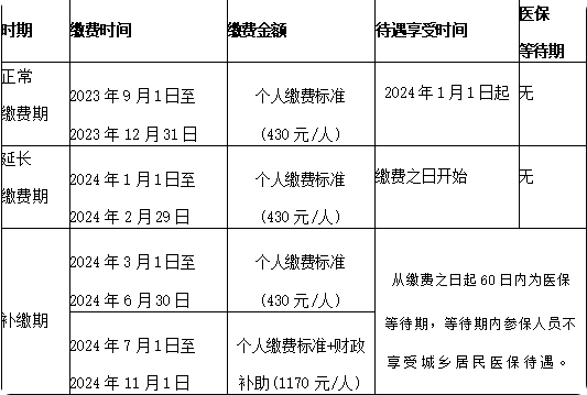 参保缴费期限为2023年9月1日至2024年2月29 日,待遇享受期限为2024年1月1日至12月31日,其中2024年1月1日至2024年2月29日缴费的,从缴费之日开始享受医保待遇。