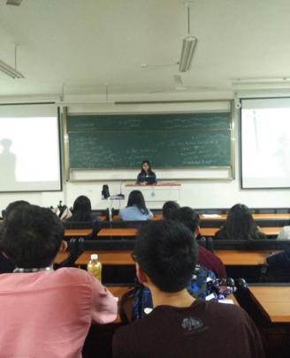 图一:鸿投负责人陈婕同学正在给俱乐部成员播放关于创业比赛的视频。