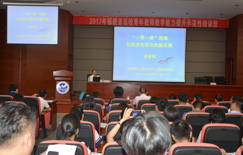 8月5日,北京师范大学博士生导师赵春明教授应邀在我校学术报告厅作题为“’一带一路’战略与经济全球化的新发展”“人文社科精品课程建设的实践与体会——以国际贸易课程为例”的专题讲座。来自我校及全省其他高校的130多名青年教师聆听了该讲座。