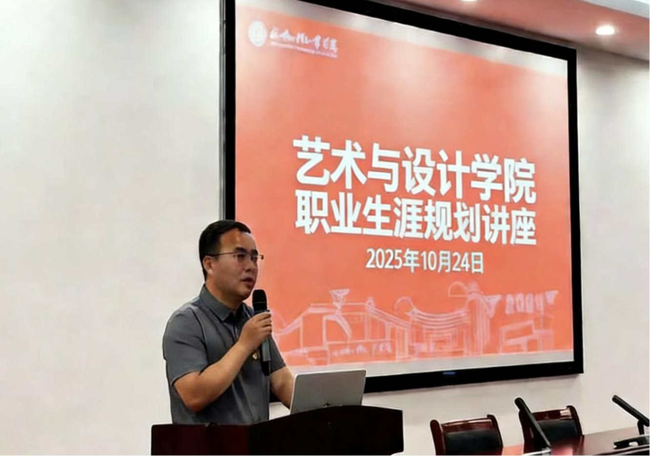 为迎接本科教育教学审核评估,深化学生职业发展意识,引导毕业生科学规划未来,2025年10月24日,艺术与设计学院副院长、分党委书记吴培煌在西区学术交流中心为2026届毕业生作题为 “扎根时代,规划未来” 的职业生涯规划专题课。