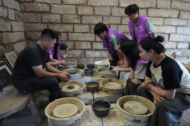 实践队的第一站来到了萌源村,这里以市级非物质文化遗产——硋器制作闻名。从取土、制坯到烧制,每一道工序都凝聚着匠人的智慧与坚守。队员们围坐在非遗传承人身旁,并亲手体验制坯的乐趣,感悟“一生专注一事”的匠人精神。