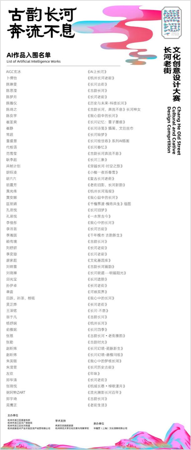 近日,由杭州市滨江区委宣传部、杭州市滨江区文广旅体局、杭州市滨江区长河街道、杭州高新技术产业开发区资产经营有限公司联合主办的“古韵长河·奔流不息—杭州长河老街文创与AI创意设计大赛”公布了大赛结果,我院视觉传达设计系学子在AI创意单元斩获佳绩,优秀奖1项,入围20项。据悉,大赛AI创意单元优秀奖仅设置5名,其中1名为我院2023级视觉传达设计3班俞雅妮同学(指导老师:陈昕)。