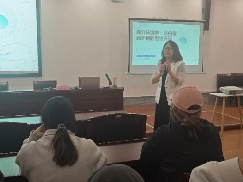 随后,李翠敏老师系统梳理了媒介环境学派的理论脉络:从伊尼斯提出“时间偏向媒介”与“空间偏向媒介”,到麦克卢汉“媒介是人的延伸”和“地球村”预言,再到波兹曼在《娱乐至死》《童年的消逝》中对电子媒介的深刻批判。“手机已经长在我们身上了,” 李翠敏老师说,“出门没带手机,就像没带手一样。我们以为自己在支配技术,实际上早已被技术垄断、被技术规训。”这些话如雷贯耳,深深打动了在场的师生,既有极强的学术性,又有鲜明的时代性和批判性。