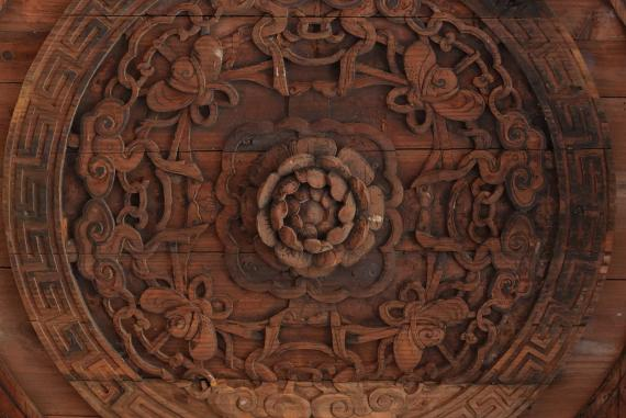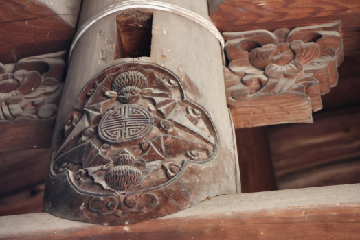 在连续走访中,团队发现,古厝里的“福”并不只是一个“福”字,而是以多形态、多载体融入家宅空间。门扇上常见成组对称的团纹彩绘,中心以“福”字或吉语为主纹,外围配卷草、回纹、如意云头、祥云等纹样,既讲究左右成对的喜气,也寓意“进门见福、福气入宅”;槛窗与木隔扇中,多见“福”字入格的镂空透雕,把字形做成结构骨架,光影穿行其间,既透气采光,也像把“福”投进屋里,呈现“透福入室、福气流动”的意象;梁架、斗拱、雀替等构件处,则常以团寿、祥云、如意纹等吉祥意象与“福”相互呼应,把祝愿安放在更稳、更关键的位置,表达“福寿相伴、家宅久长”的期待;在部分装饰器物上,还能看到“福星形象与大福字”的组合,线条圆润、寓意直白,让抽象的祝福变成看得见、摸得着的家宅记忆。通过对不同构件位置、纹样组合与工艺细节的对照梳理,团队逐步形成“门扇聚福、槛窗透福、梁架承福、器物呈福”的观察线索,让“福”在古厝中的分布逻辑更清晰,也更便于大众理解与传播。