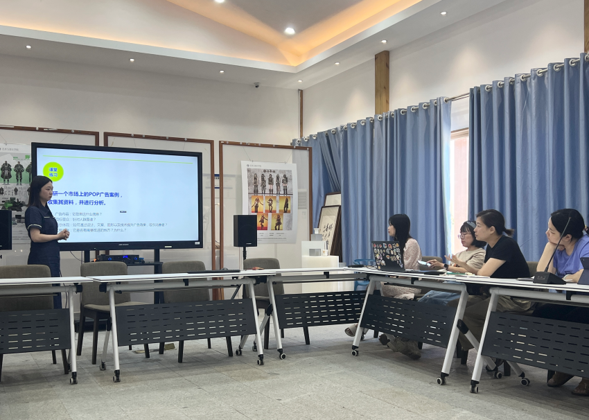 新进教师杨枝在《POP广告设计》课程中,以本土地域文化为切入点,重点阐释了POP广告设计的发展历史,同时展示了如何将地域文化符号转化为现代视觉语言。通过对比分析商业POP案例,引导学生在课堂内完成主题促销广告设计绘制。督导点评时指出:“杨老师课程讲解过程中还可增设一些互动环节,对于时间的把控应当更加精细化,作业布置内容可与市场需求进行有机融合。”