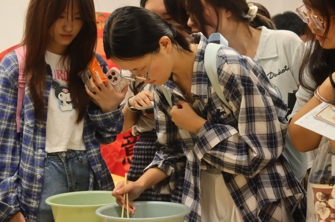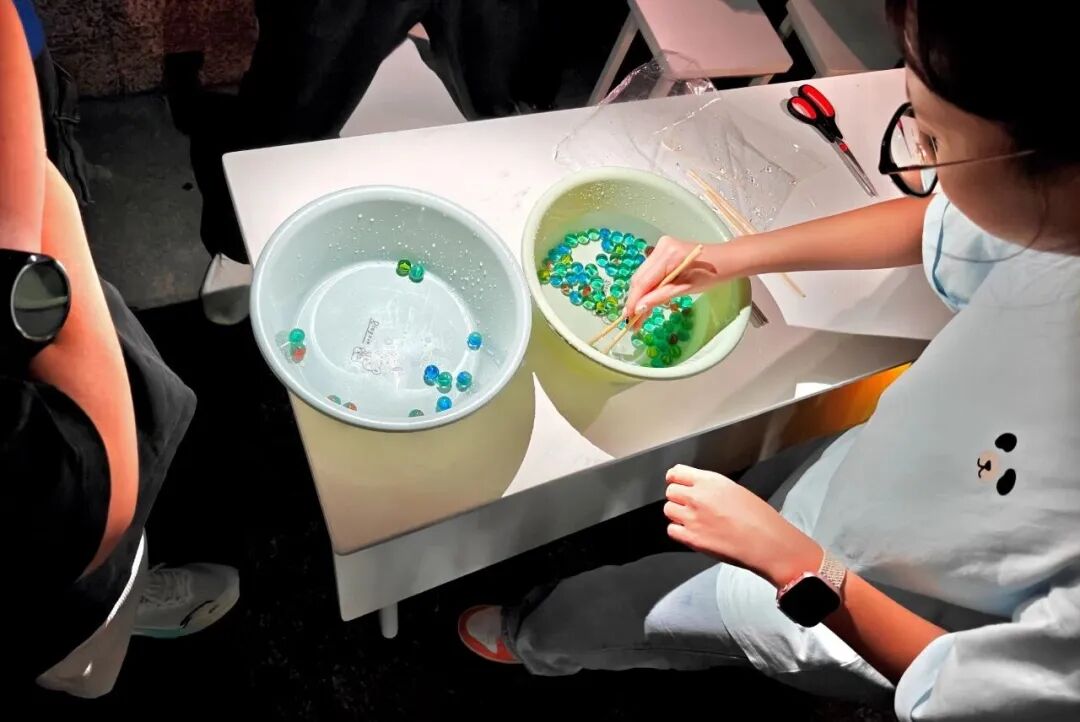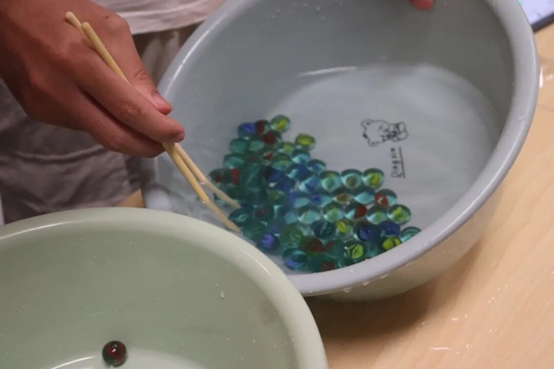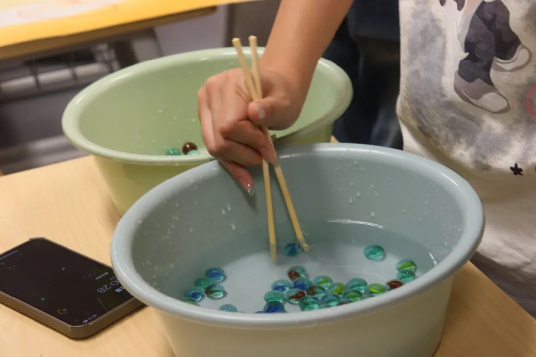 考验手稳与心静的夹弹珠比赛紧张刺激。水光潋滟中,一颗颗“明月”被成功捞起,参与者全神贯注,围观者加油助威,展现了专注与协作的精神。