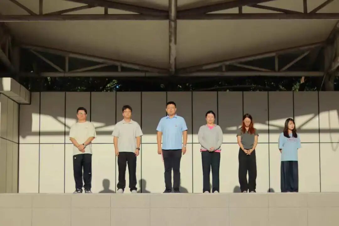 伴着朝阳,国旗护卫队迈着铿锵步伐护送五星红旗入场。在庄严的《义勇军进行曲》中,鲜艳的国旗冉冉升起。全体师生肃立凝视,目光中饱含对祖国的无限热爱。这一刻,晨光与国旗交相辉映,肃穆与深情融汇交织,澎湃的爱国热情与深厚的历史情怀在每个人心中激荡。