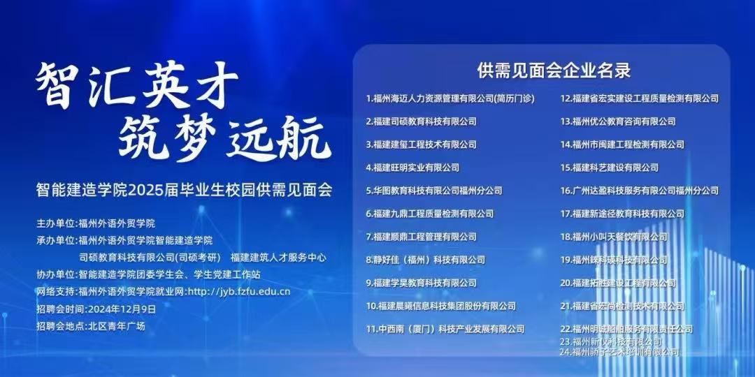 为深入贯彻就业优先战略,精准对接毕业生就业需求,切实做好2025届毕业生就业服务,2024年12月9日,由智能建造学院主办,福州海迈人力资源管理有限公司 、司硕教育科技有限公司联合承办的“智汇英才·筑梦远航”2025届毕业生专场校园供需见面会在北区青年广场顺利举行。本次招聘会通过搭建校企直通平台,汇聚优质岗位资源,着力提升毕业生就业质量,为用人单位与求职者构建高效精准的对接桥梁,助力毕业生在新时代浪潮中扬帆起航。