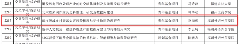 近日,中华人民共和国教育部社科司公布了2025年度教育部人文社会科学研究一般项目评审结果,我院李尚辉老师主持的《闽江流域乡村聚落灾害风险机理与韧性协同治理研究》成功获批人文社科青年基金项目立项!